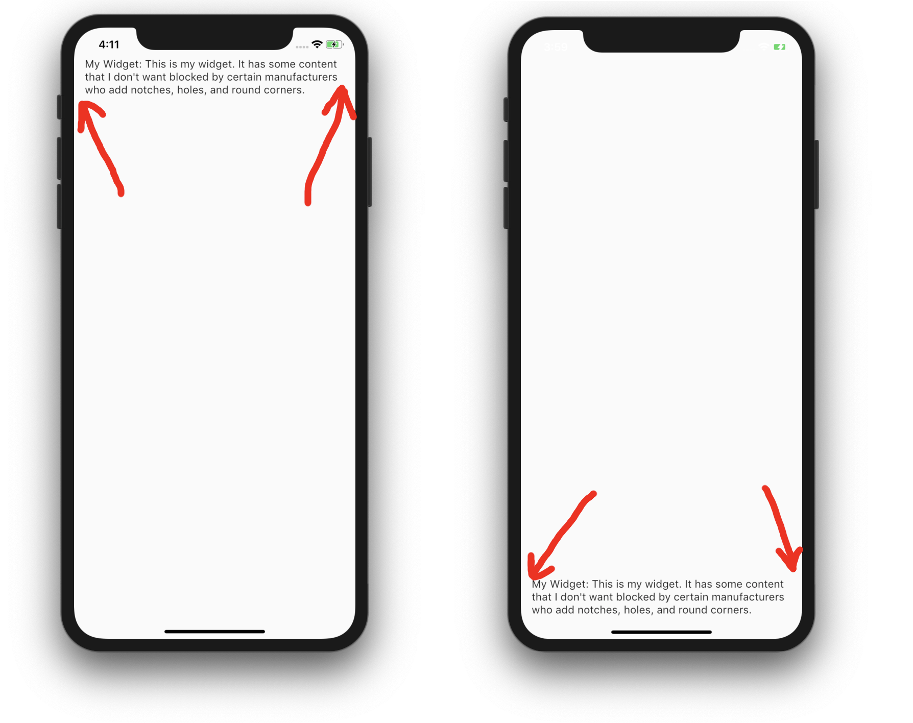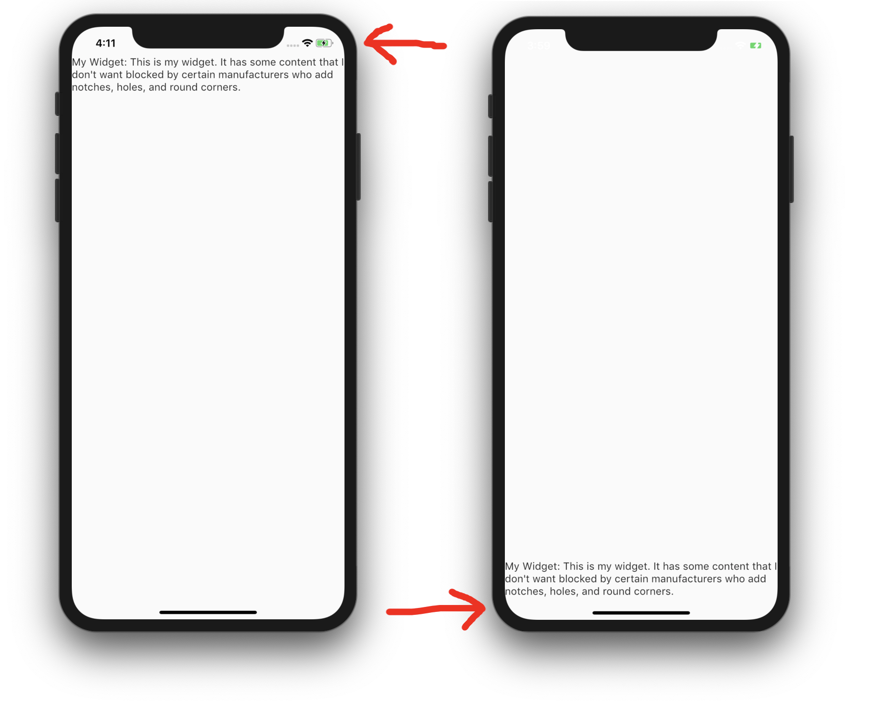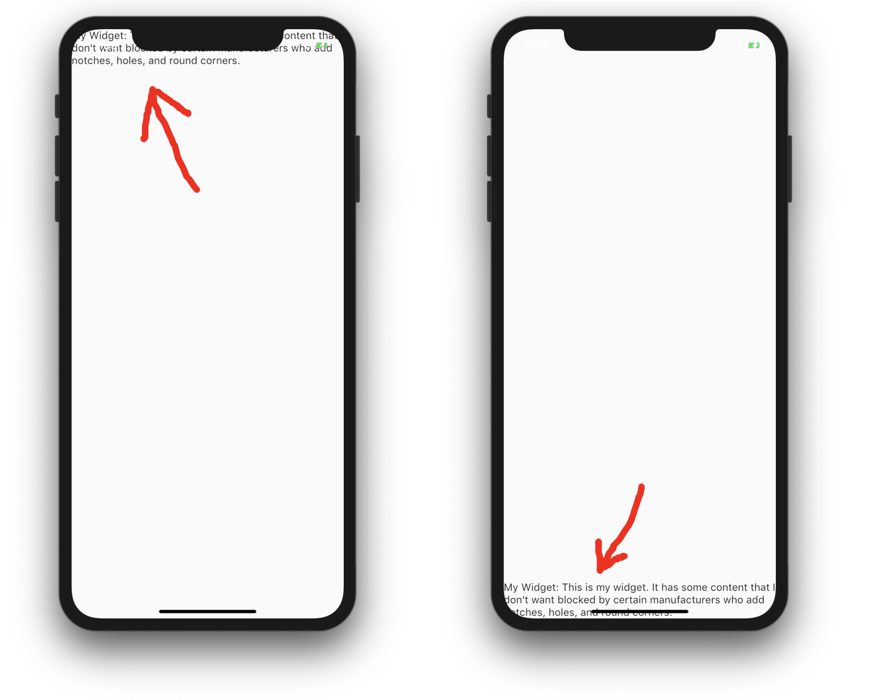 例如:如果您将小部件A放在屏幕顶部的安全区域中,并将" top “参数设置为false,则它将被iPhone的X和Pixel 3的凹槽裁剪。