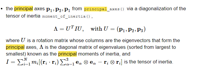 AtomGroup.principal_axes()方法返回一个数组[p1, p2, p3],其中主轴p1、p2、p3是长度为3的数组;为了方便地选择这个布局为行向量(这样就可以用p1, p2, p3 = ag.principal_axes()提取向量)。要形成一个矩阵U,其中主轴是列向量,就像通常对待主轴时一样,必须转置。例如:
