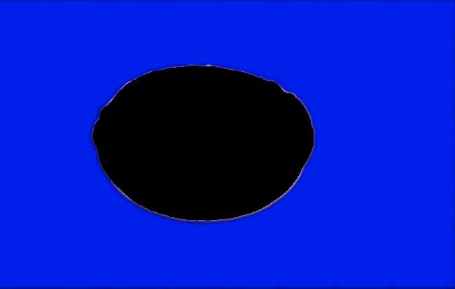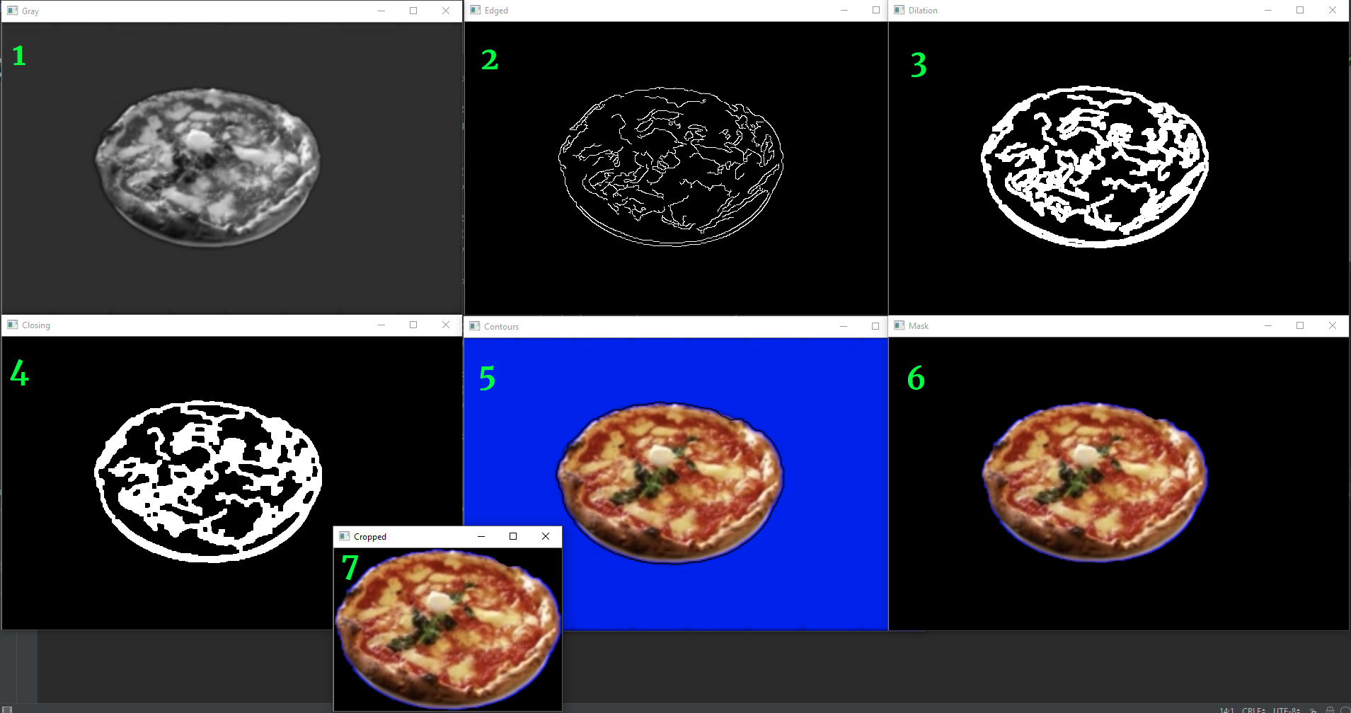 我使用InRange函数(inRange in OpenCV)定义蓝色的上、下阈值以创建掩码,然后使用CopyToWithMask函数(OpenCV中的copyTo)将掩码应用到原始图像上。我希望结果是蓝色背景与比萨饼削减出来。