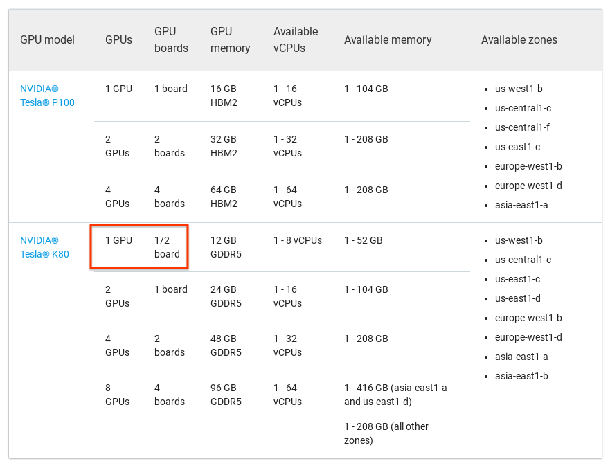 特斯拉K80是'1 GPU板‘由2个GPU组成。如果在Google平台上将VM实例上的GPU数量设置为1,则会为您分配1个GPU或一块板的一半。