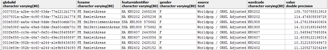 group by globalid, fcname, featureidentifier,gender, source, wardcode, value