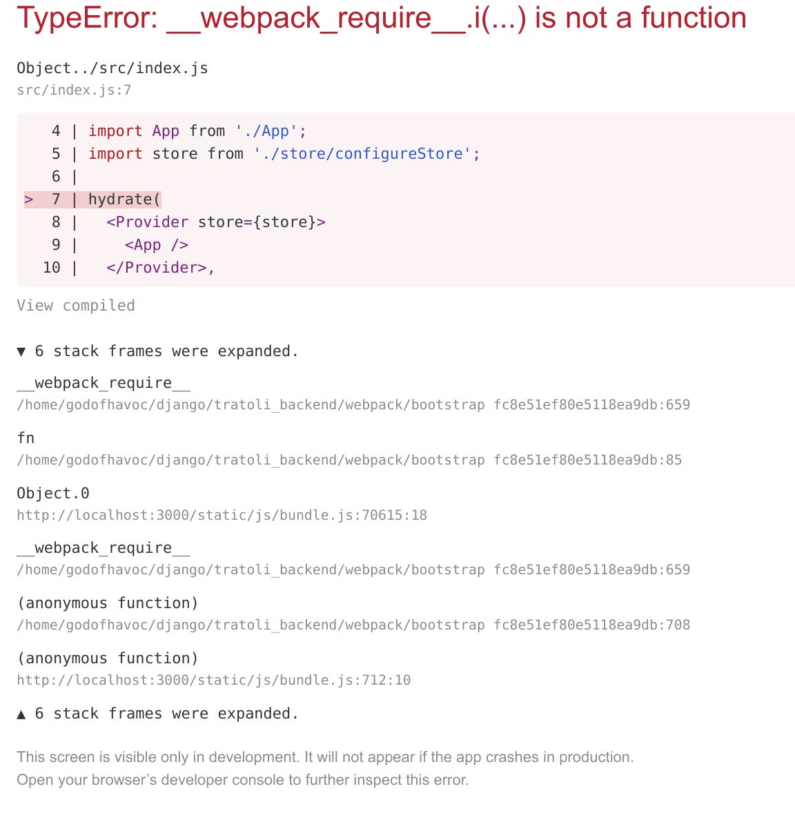 当我试图在TypeError中使用水合物()时,我得到了一个webpack的index.js。当我使用ReactDOM.render()而不是水合物时没有看到错误,而且我在服务器端呈现时使用水合物。