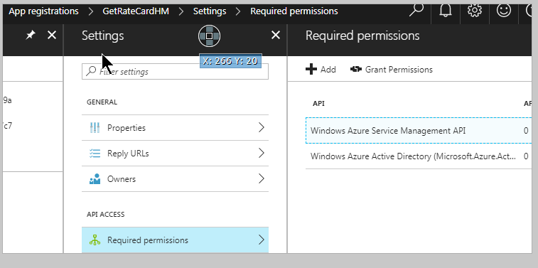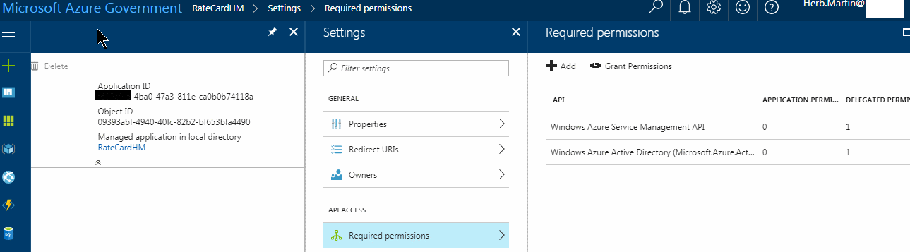 RateCardHM,appId/clientID: XXXXXXXX-4ba0-47a3-811e-ca0b0b74118a ->必需的权限->(委托- NoApplicationPermissionsAvailable)作为组织用户访问Azure服务管理(预览)