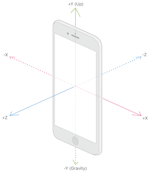 这个类有一个名为“姿态”的属性,它用滚动、俯仰和偏航来描述设备的旋转。如果我们拿着我们的手机在纵向方向,滚动描述旋转的角度围绕着通过手机的顶部和底部的轴。音高描述了通过手机两侧的轴线旋转的角度(音量按钮在那里)。最后,偏航描述了通过手机前后轴的旋转角度。有了这三个值,我们就可以确定用户是如何拿着他们的手机的参考什么将是平地(斯蒂芬·贝克)。