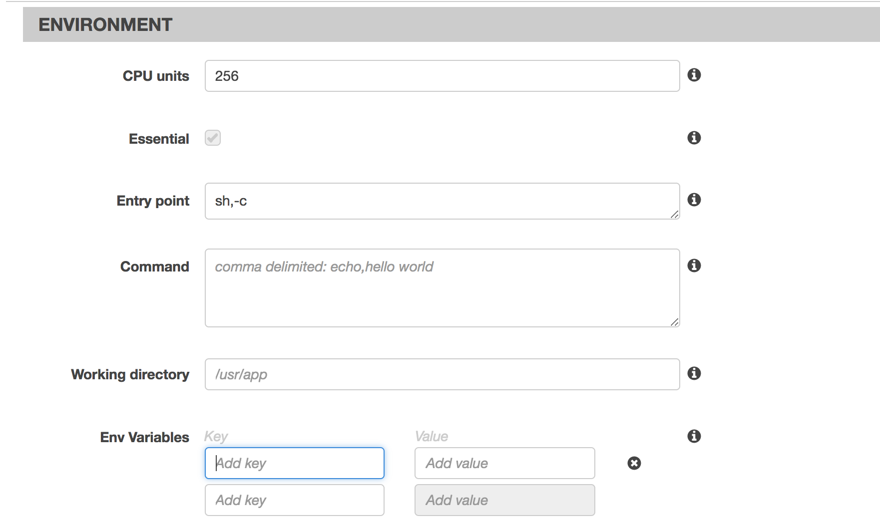 首先,当您编辑/配置一个新容器时,它要求您指定要使用的映像,但也有一个Environment部分: