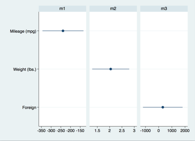 coefplot (m1, xscale(range(-350 -50))) || (m2, xscale(range(1 3))) || (m3, xscale(range(-1200 2000))) ///
