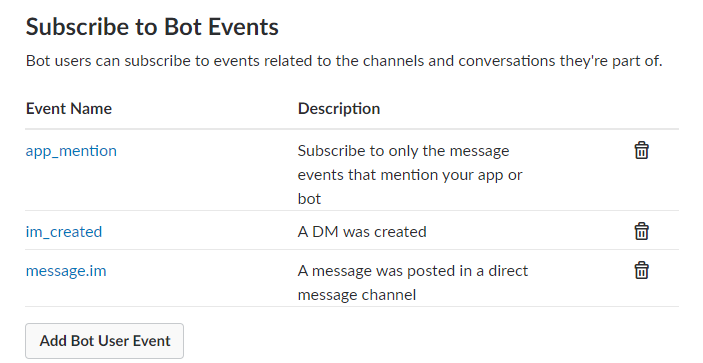 但是,为了通过像@bot hello这样的方式来响应通道中的消息,我意识到必须将app_mention事件添加到中,订阅Bot 表单。