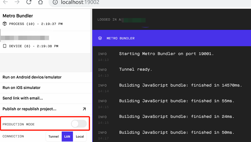 在通常在Expo DevTools上运行的http://localhost:19002窗口中,只需关闭production mode即可。