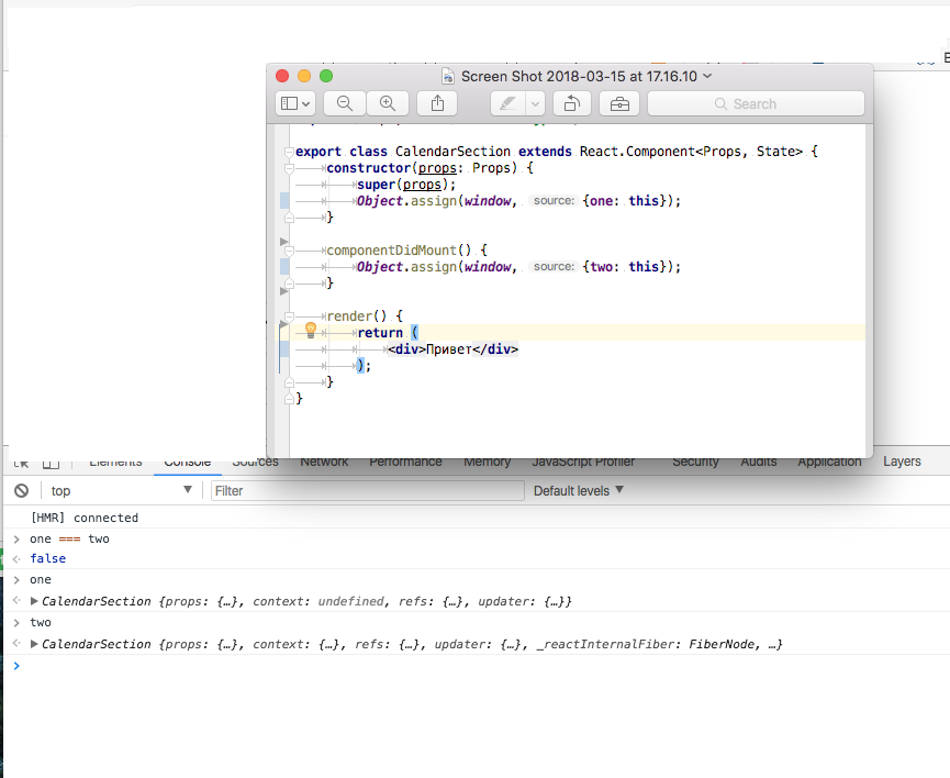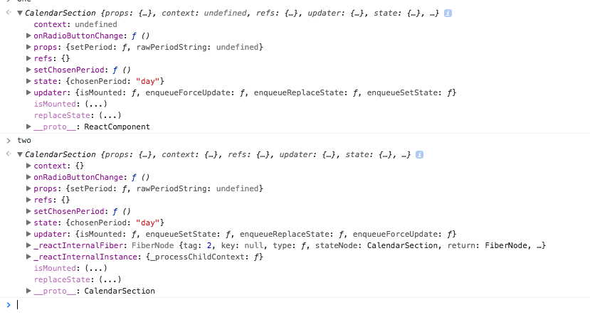 如您所见,two具有更多的属性。这是因为在构造函数的第一次输出中,它是一个纯Javascript类。然后,反应出现并改变类在渲染之前、期间和之后。