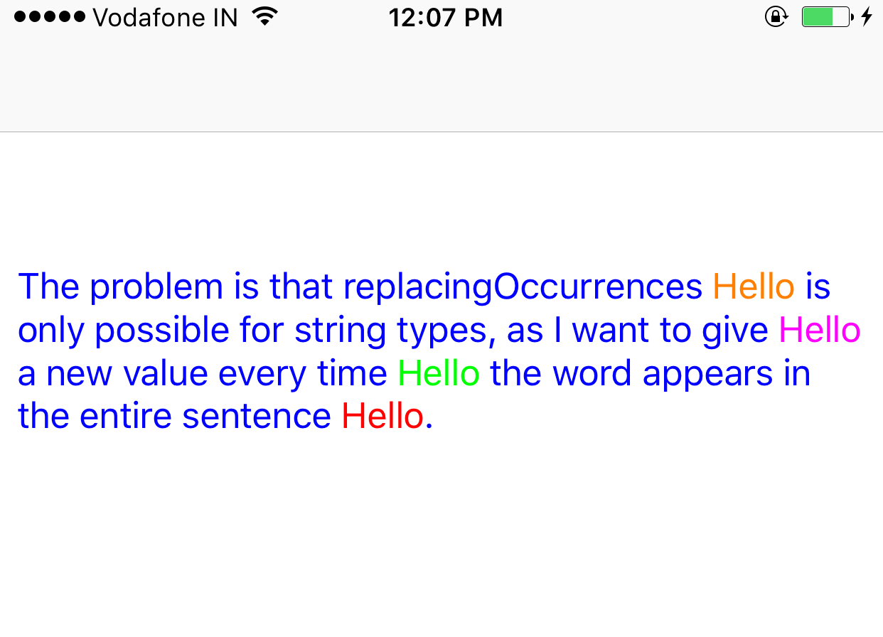 let str = "The problem is that replacingOccurrences Hello is only possible for string types, as I want to give Hello a new value every time Hello the word appears in the entire sentence Hello."