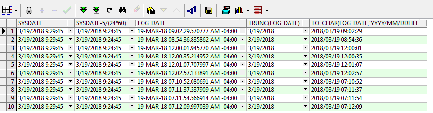 SELECT SYSDATE, SYSDATE - 5/(24*60),LOG_DATE,TRUNC(LOG_DATE),TO_CHAR(LOG_DATE,'YYYY/MM/DD HH:MI:SS')