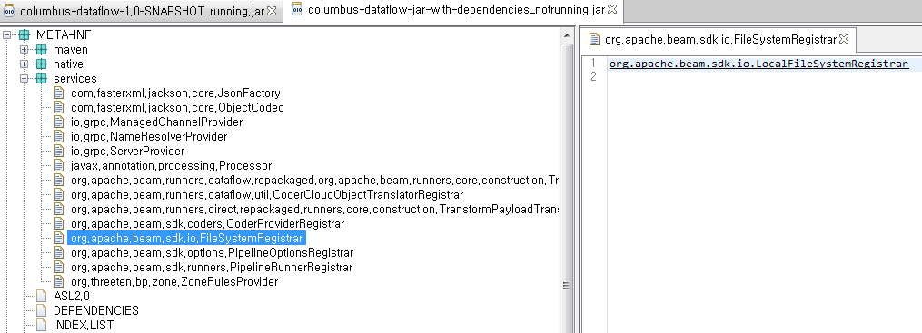 但是使用阴影插件并不能解决这个问题,我只是幸运的是,这个类是GcsFileSystemRegistrar没有被覆盖。当我更改依赖项顺序时,同样的问题再次发生。