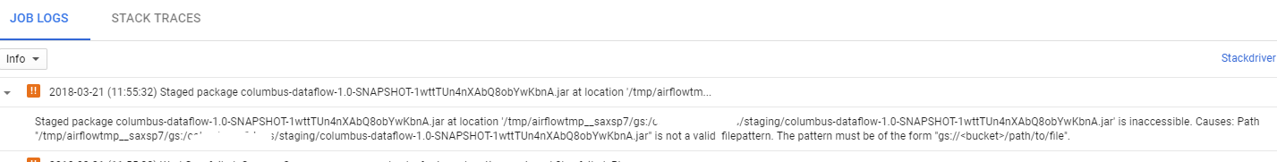 这是我用于数据流的选项:--project=myproject --stagingLocation=gs://mybucket/staging2 --tempLocation=gs://mybucket/gcp-temp2 --gcpTempLocation=gs://mybucket/gcp-temp2 --bigtableProjectId=myinstance --bigtableInstanceId=user-test --bigtableTableId=test_table1