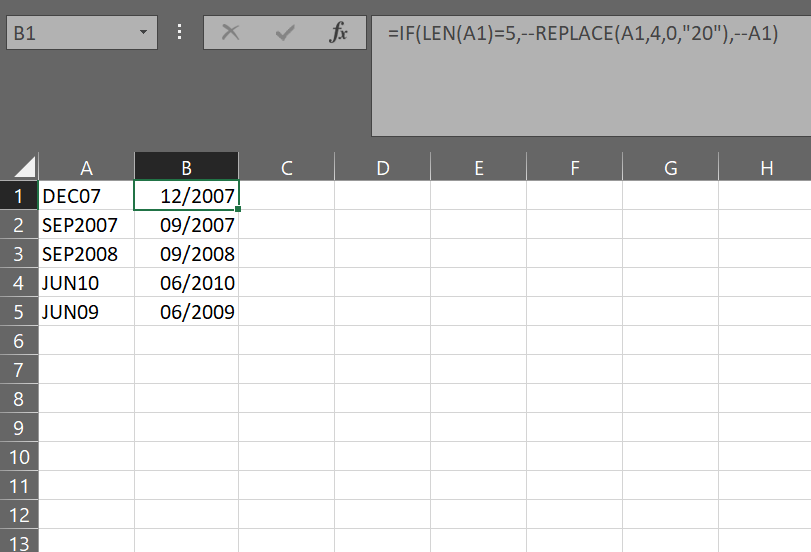 =IF(LEN(A1)=5,--REPLACE(A1,4,0,"20"),--A1)然后格式化单元格: