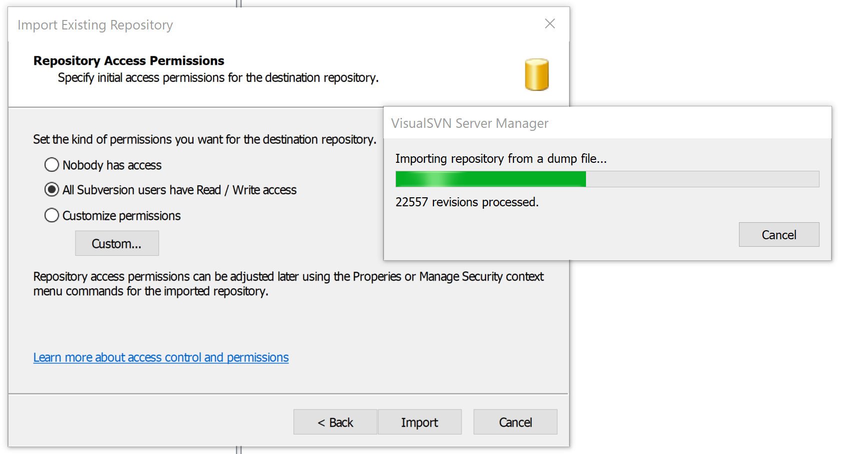 通常,您应该在VisualSVN服务器管理器控制台中使用导入现有存储库向导导入Subversion存储库。