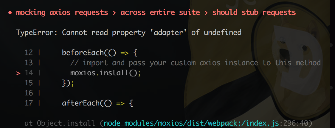 下面是示例,但是我的测试错误出现在moxios.install()行上: