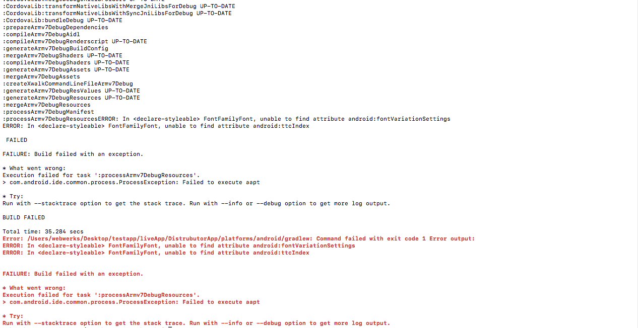 我是新来的科多瓦,phonegap。我不能为android平台构建,它在IOS平台上运行得很好。我无法追踪确切的问题。我删除字体,并为android构建,但仍有错误。
