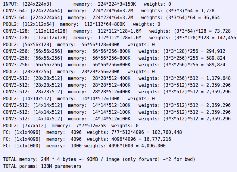 但是,请注意,如果在任何框架(Caffe、Tensorflow等)中编码VGG网络,则模型的总大小将包括参数,并且这一部分要大得多,正如作者在计算中所显示的(这似乎是正确的)。