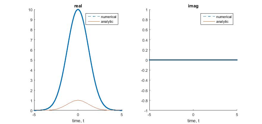 xlim([-5,5])当我将IFFT的结果与解析表达式进行比较时,他们似乎并不同意: