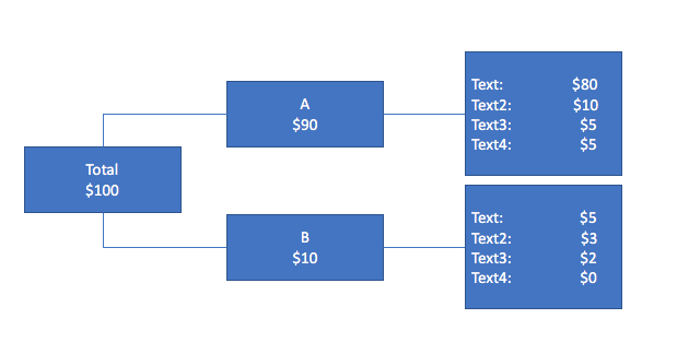 这里的“总计”是整个数据框架的总价值,"A“和"B”框是每个产品的总价值,然后每个产品和类别的值位于最右边的框中。