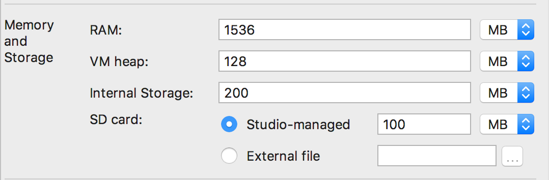 我试图减少我的AVDs (Android仿真器)使用的磁盘空间。我有3个AVDs。2使用4-5 GB (每个),一个只需要2.7 GB.我正在尝试重新创建更小的AVDs,占用不超过2GB。创建新的AVD时,输入200 MB用于内部存储,100 MB用于SD卡。然后创建AVD,发现userdata.img占用2.15GB(OSX10.11.6)。