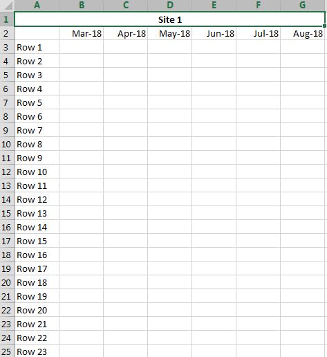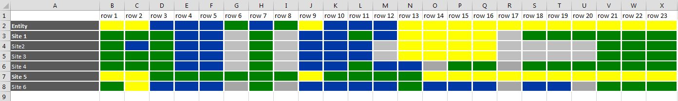 查看工作表1-Mar18,我想将单元格颜色从第3行(B3到X3)复制到工作表7-站点1列B (B3到B23)。我也有额外的工作表,4月18日至12月18日和第2站点到第6站点,在那里我想执行类似的行动。