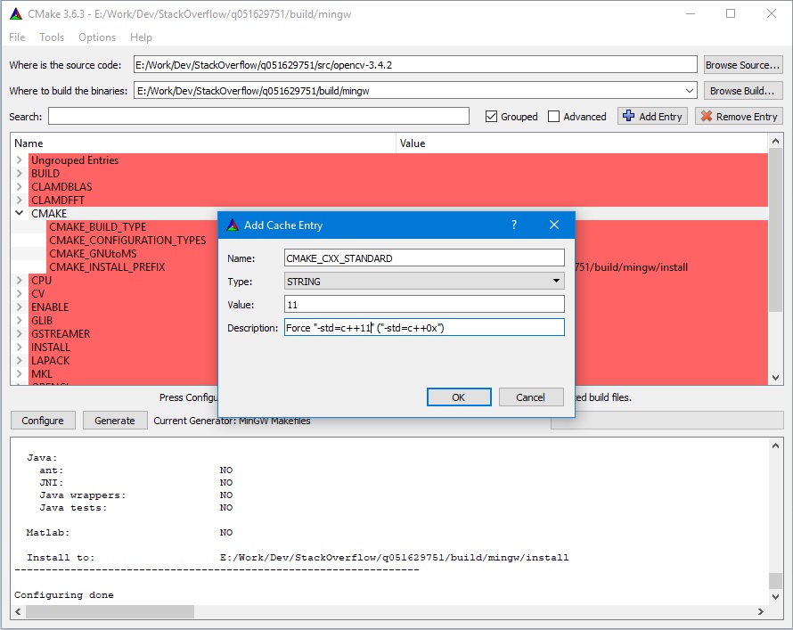 我安装了Qt 5.10最新版本和opencv3.4.1,我无法在这个版本的Qt中安装Cmake,有人能帮我在windows 10 64位上完成吗?我尝试使用这个视频也是https://www.youtube.com/watch?v=ZOSu-2Oju-A,在cmd步骤中我有这个(在这个链接中的图片)