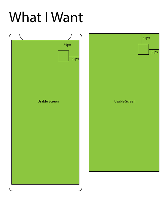 例如,如果我将一个UI元素放置在屏幕右侧边缘的左侧35个单元上。在iPhone7上,UI元素将从可用屏幕的顶部向下放置35个单元,而在iPhoneX上,UI元素将总共放置35个单元减去屏幕顶部的屏幕缺口高度(如果缺口为20个单元,则为5个单元)。