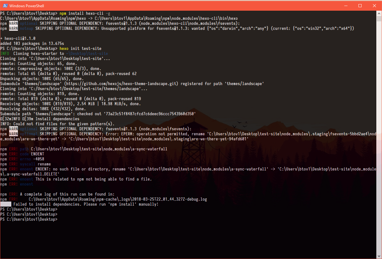 我正在尝试初始化我的Windows 10 PC上的一个Hexo站点。我安装了Node 9.9.0和git 2.16.2.windows.1。