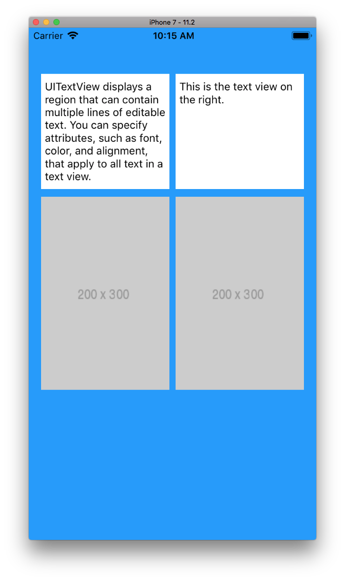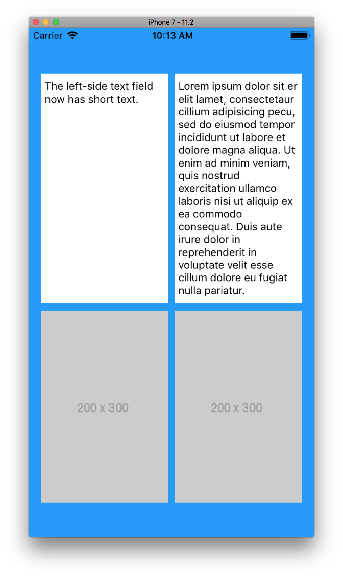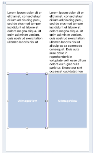 包含图像视图的水平UIStackView应该是Alignment: Top、Distribution: Fill Equally和Spacing: 8。给每个图像视图一个适当的高宽比约束--在下面的图像中,图像是200x300像素,所以我将比率设置为2:3。