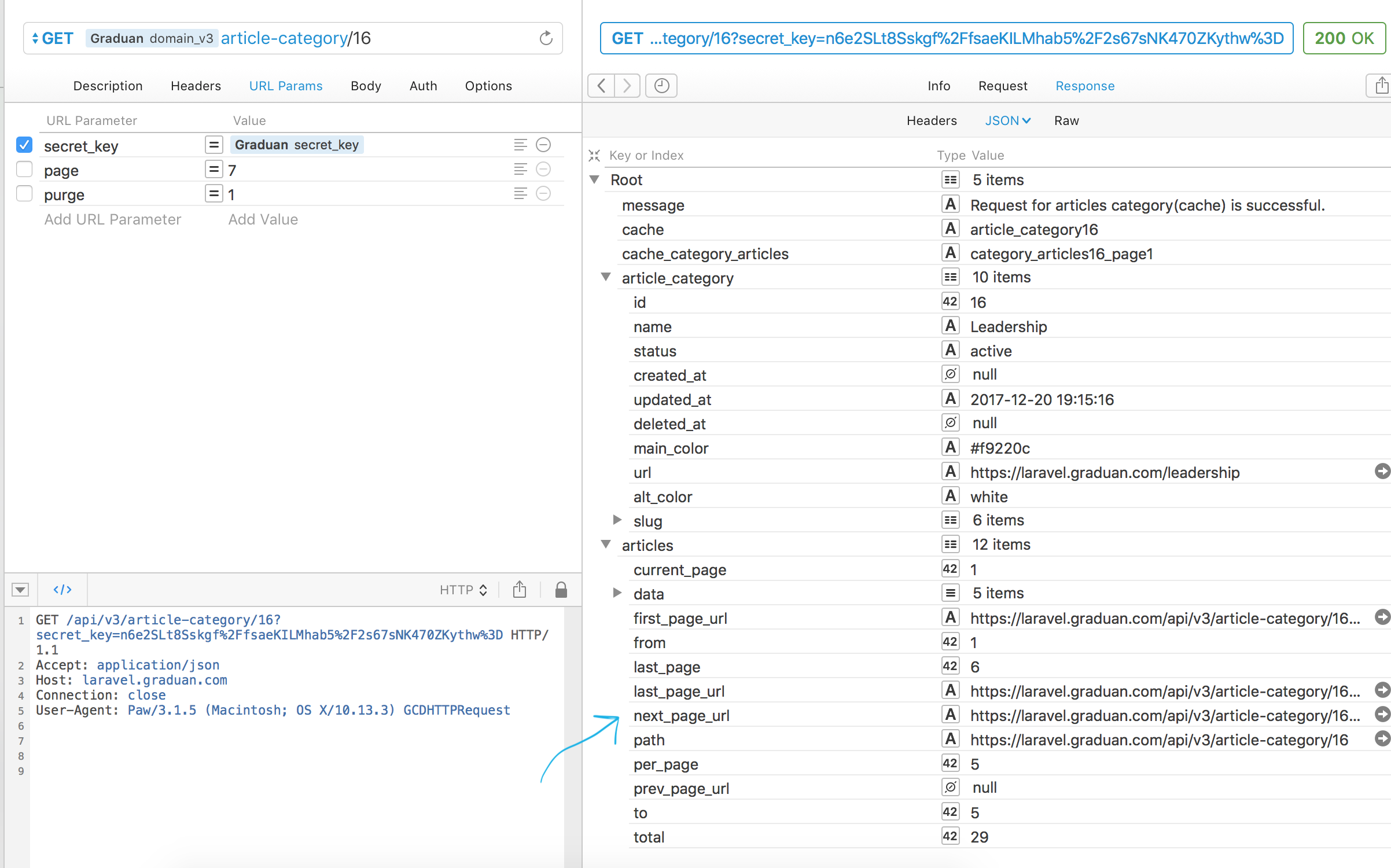 我是开发ios应用程序的新手。还是不知道多少。我可以成功地显示文章只从第一页,但未能显示其他文章从其他网页时,我滚动向上看更多。如果有人知道如何从我的收藏视图分页,我真的需要帮助。下面是我使用的api的图片。