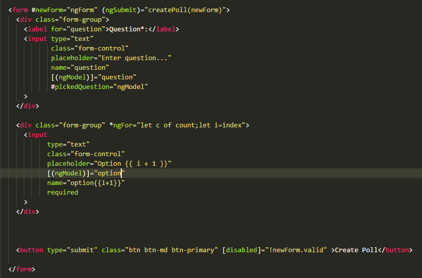 因为有两个输入的字段,所以我希望为每个字段绑定(选项1&选项2分别作为option1和option2,因此我可以在ts文件中引用它)。但是,当我为第一个字段键入选项时,第二个字段也得到相同的值&同样,对于第二个字段也是如此。如何为每个输入字段设置双向绑定?