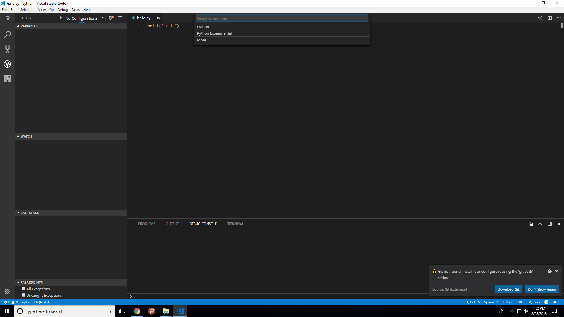 如果我选择Python,它将进入调试模式。所以,没有任何输出。