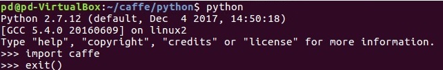 >>> import caffe或者,您可以修改您的~/.bashrc文件并在那里修复PYTHONPATH环境变量。