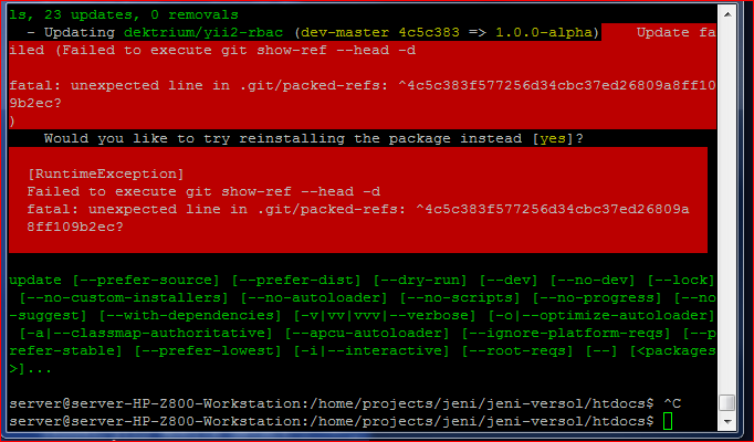 “更新失败(未能执行git ref-head -d致命:在.git/ package中的意外行:^4c5c383f577256d34cbc37ed26809a8ff109b2ec?)是否尝试重新安装该软件包? RuntimeException未能执行git show-ref -d 致命:..git/包装中的意外行--参:^4c5c383f577256d34cbc37ed26809a 8ff109b2ec?“