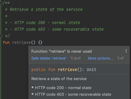 我可以用kotlin & IntelijIdea实现同样的目标吗?也许kotlin还有另一个选择来打破KDoc的界限?
