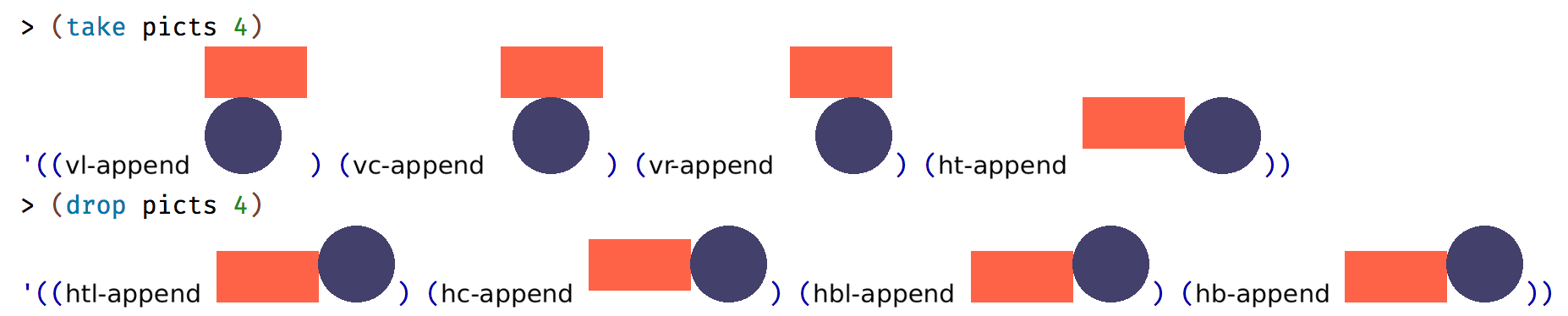 球拍的pict,有几个组合其他图片的组合器。这些文档包含一个很好的表,用于说明它的*-append组合器的工作方式: