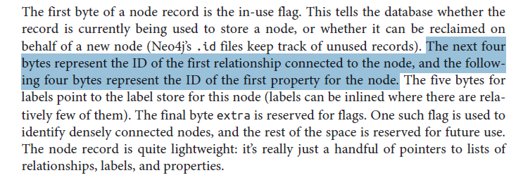 我在书中读到了关于Neo4j底层基础结构的内容,我想我在文本中发现了一个矛盾的.Here:“接下来的四个字节表示连接到节点的第一个关系的ID,下面的四个字节表示节点的第一个属性的ID”: