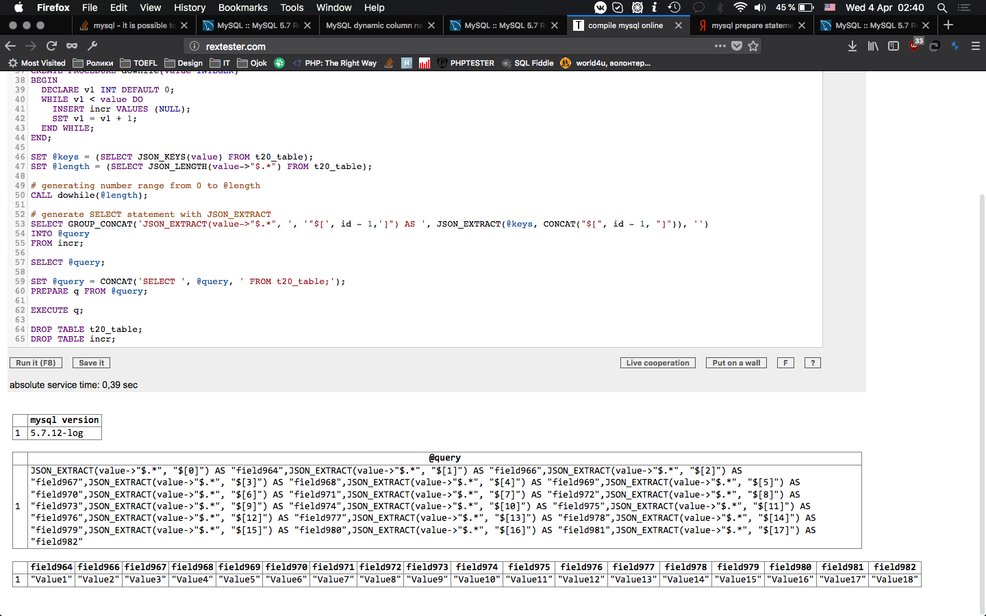 SELECT GROUP_CONCAT('JSON_EXTRACT(value->"$.*", ', '"$[', id - 1,']") AS ', JSON_EXTRACT(@keys, CONCAT("$[", id - 1, "]")), '')