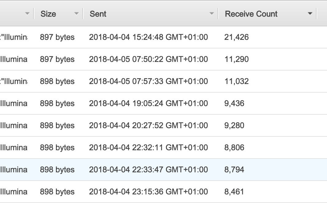 当我在SQS中查看消息时,我看到非常高的“接收计数”。有些像21,000+那样高!