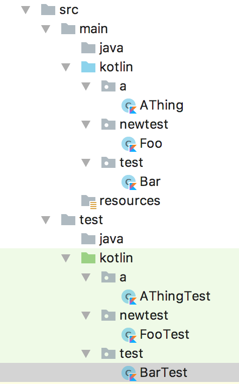 我从kotlin repo 这里的maven示例开始,它运行得很好。当增加更多测试时,就会出现这个问题。当我添加更多的测试(在嵌套包中)时,只有一个测试实际得到“运行”,其他测试似乎只是运行了一个虚拟测试方法。例如,给定以下层次结构: