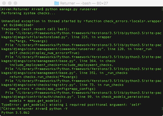 我刚开始学习Django,使用django-admin startproject Returner创建了第一个项目,在运行它时遇到了一个错误: