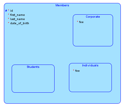 在标准ER建模中,您描述的情况称为泛化/专门化。学生会员资格、企业会员资格和个人会员资格都是专门的会员形式。在ER图(实际上是EER图)中,如下所示:图表