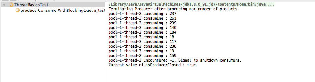 }在执行此操作时,我的使用者线程会卡在queue.take()上,就好像它们在等待队列中的产品可用一样。一种可能是:所有使用者线程同时检查条件isProducerClosed.get(),进入while循环,并访问queue.take()方法。这是正确的假设吗?如果是,是否有任何方法可以不使用低级别synchronized关键字来实现这一点?我对volatile boolean变量做了同样的尝试,结果完全一样。只有在使该变量保持静态之后,我才能够看到所有消费者在队列中遇到-1后被终止(因为var现在是类的)。