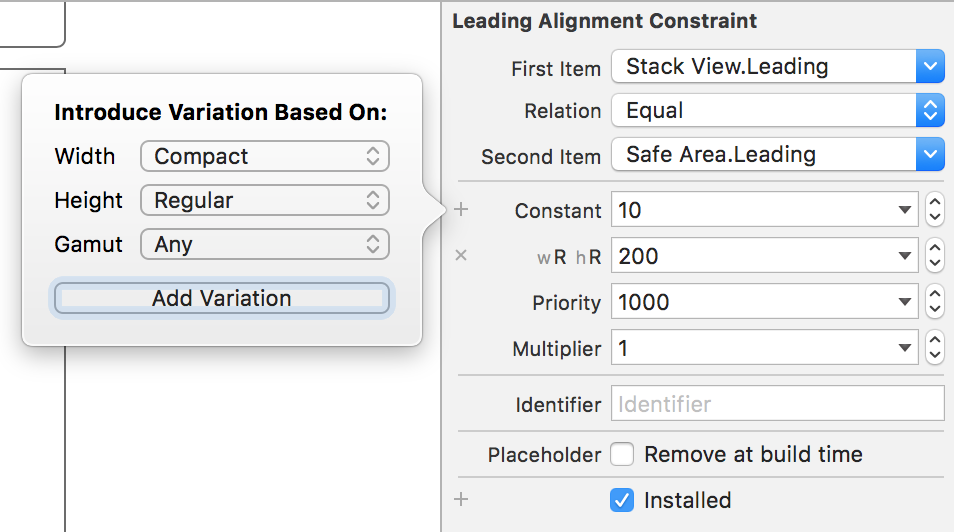 现在,双击前导和尾随约束将打开大小属性。点击Constant前面的"+“图标。它会让你看到一个弹出式的。为Regular Width Regular Height添加iPad并将值设置为200 (我已经给出了200,您可以根据您的计算和需求给出)。这将如下图所示