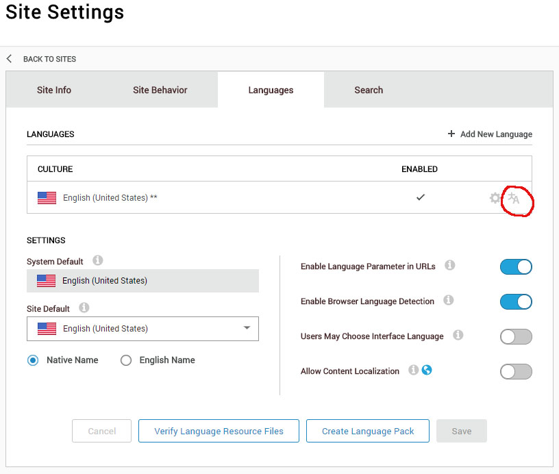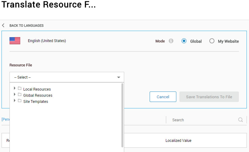 去Manage > Sites。然后单击门户设置图标,选择门户设置。在“网站设置”中,转到“Languages”并单击“文化”之后的最后一个图标。然后进入Translate Resources选项卡,您可以选择要编辑的语言文件。