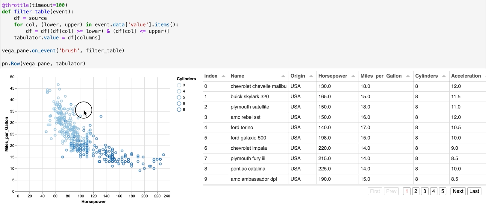收听Vega事件和为例如选定的点定义自定义回调的能力最近被合并到Panel中,并包含在0.13版本中!这是唯一支持Altair图表中选择的自定义回调的Python仪表板包。这是文档中的一个例子