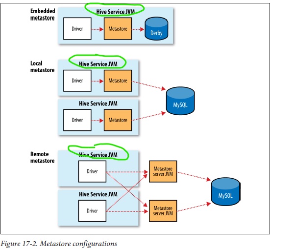 客户端连接到“驱动服务JVM”(hiveserver2服务),它可以通过三种不同的方式配置来使用metastore服务。默认方式是“嵌入式”Derby数据库,这是Java进程本身。