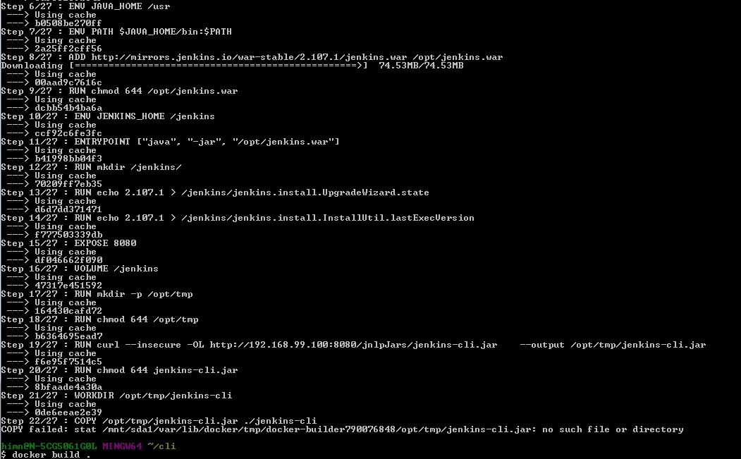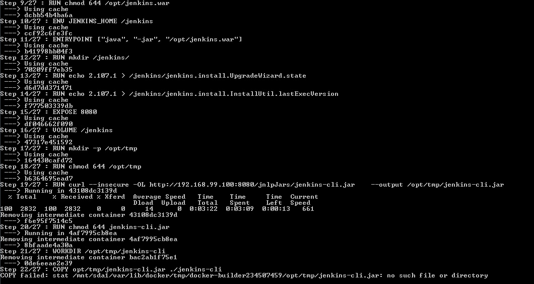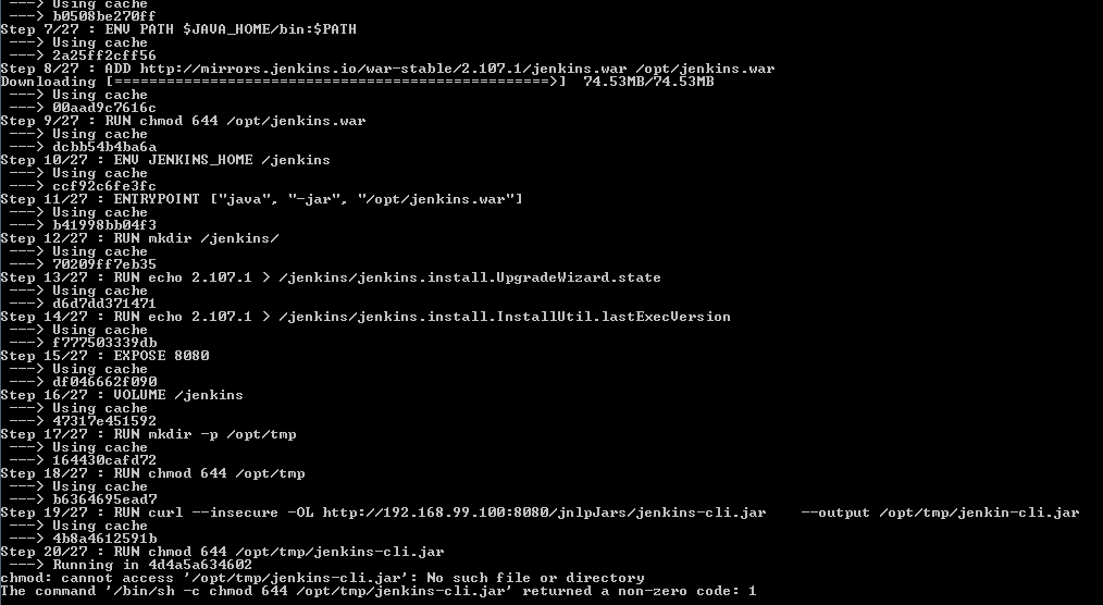 这看起来像是一个错误。在curl命令(即步骤19/27 )中,--output是/opt/tmp/jenkin-cli.jar,它需要是/opt/tmp/jenkins-cli.jar。