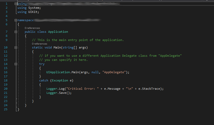 在Xamarin.iOS中,我可以简单地将我的主方法封装在一个尝试捕获块中,如您在下面的屏幕快照中所看到的:
